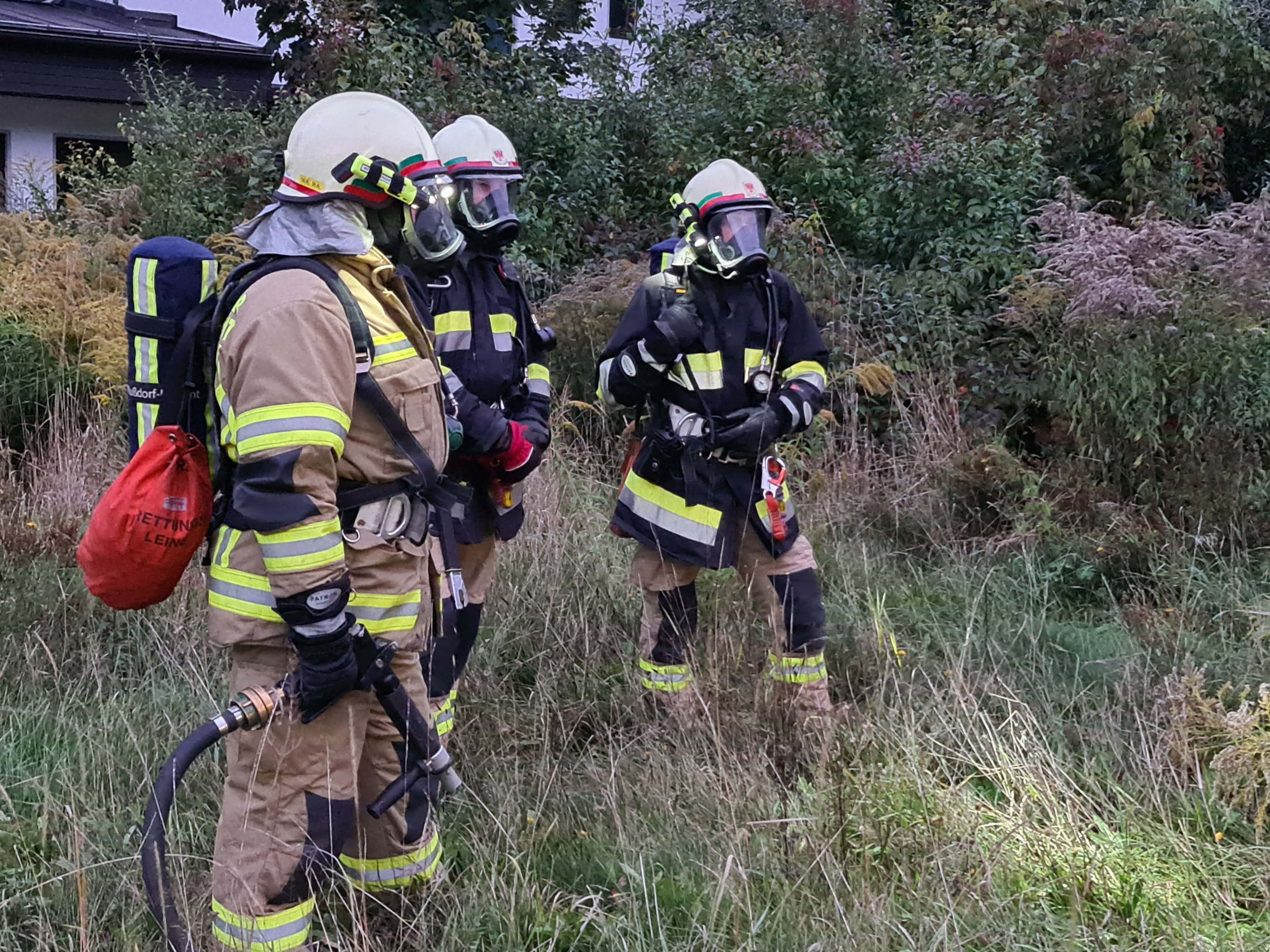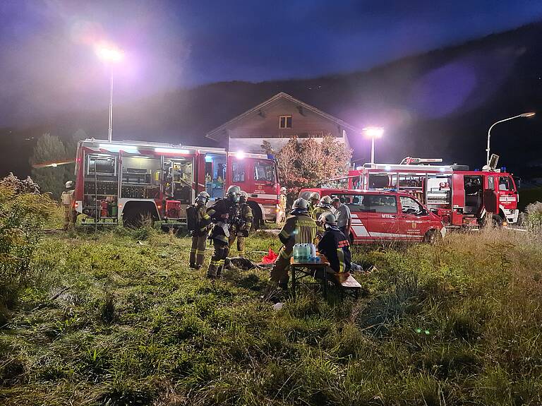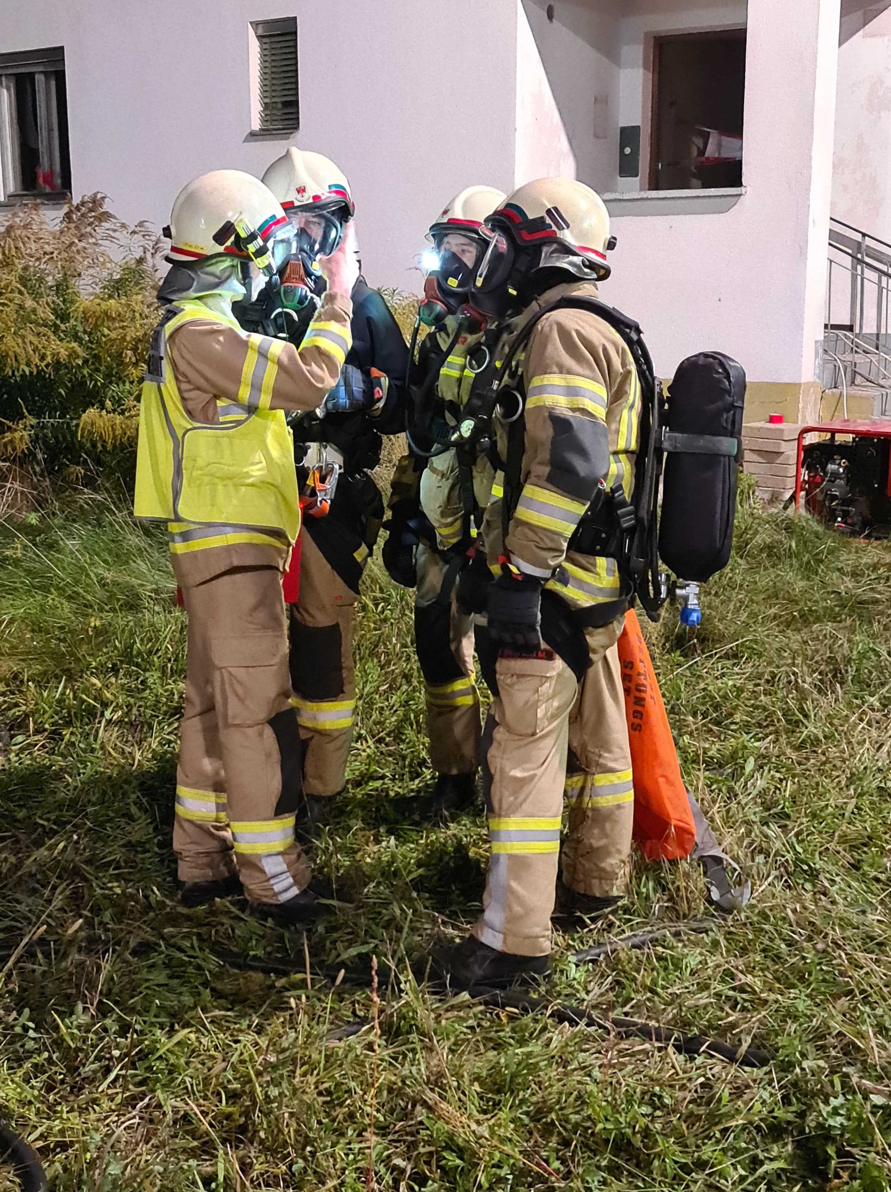 Als wir am Übungs-/Einsatzort eintrafen, wurden von der Einsatzleitung sofort drei Atemschutztrupps vom TLF, RLF, und LF in das verrauchte Gebäude geschickt, um die Lage zu erkunden, die vermissten Person zu retten, weitere Gefahren einzugrenzen und mit dem Löschangriff zu beginnen. Dazu wurde ebenso eine Atemschutzsammelstelle errichtet. Die Kameraden vom KLF haben parallel dazu eine Zubringerleitung vom Hydranten von einem der umliegenden Hydranten aufgebaut.