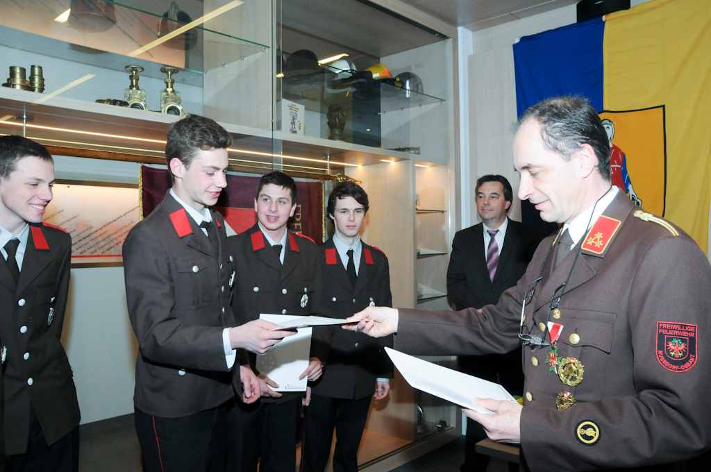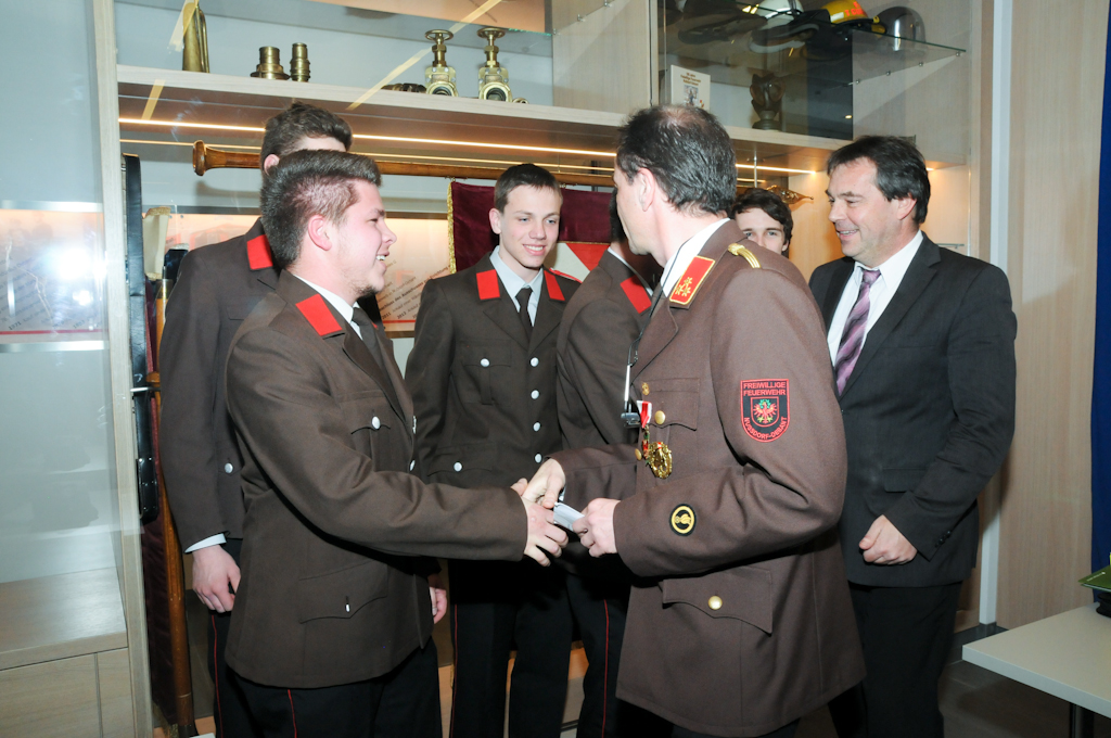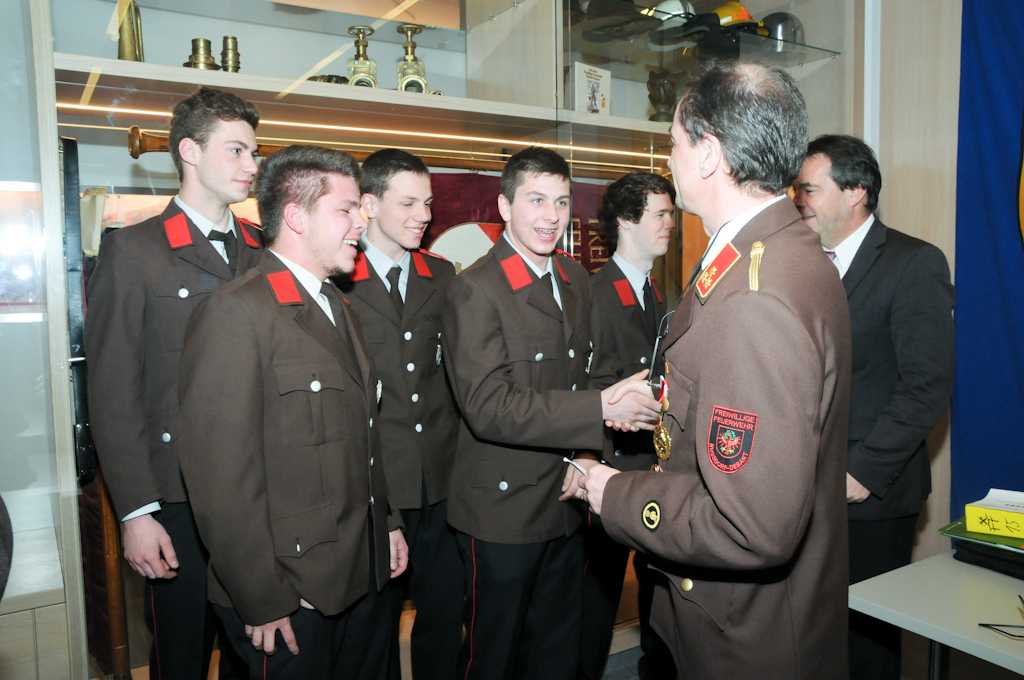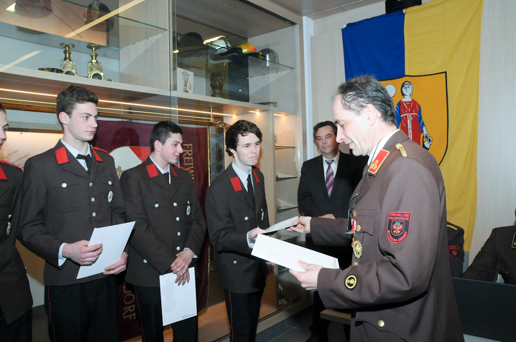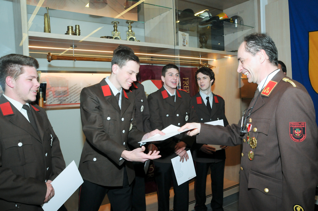 5 Jungmänner (Andre Angermann, Marcel Birschl, Lukas Mitterdorfer, Andre Rainer und Mario Stotter) haben die Angelobungsformel nachgesprochen und konnten somit zum Feuerwehrmann befördert werden. Christian Groder ist nun Oberfeuerwehrmann und Manuel Holzer und Christoph Kammerlander Hauptfeuerwehrmann. Zum Löschmeister befördert wurden Reinhold Ebner, Thomas Lenzhofer und Thomas Pfurner.