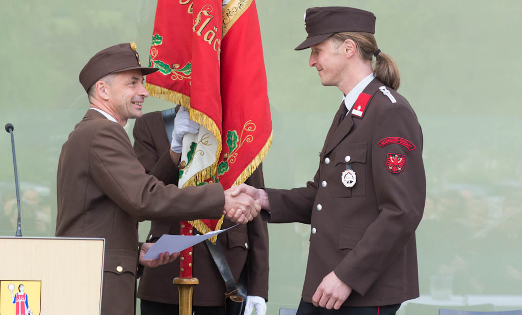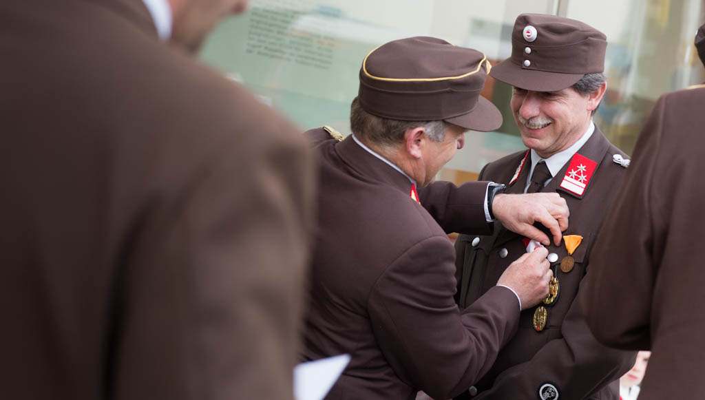 So wurde Hermann Mitteregger das bronzene Verdienstzeichen und Bernhard Lenzhofer das silberne Verdienstzeichen des Bezirksfeuerwehrverbandes von Bezirksfeuerwehrinspektor Franz Brunner überreicht.