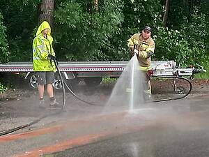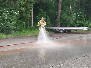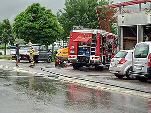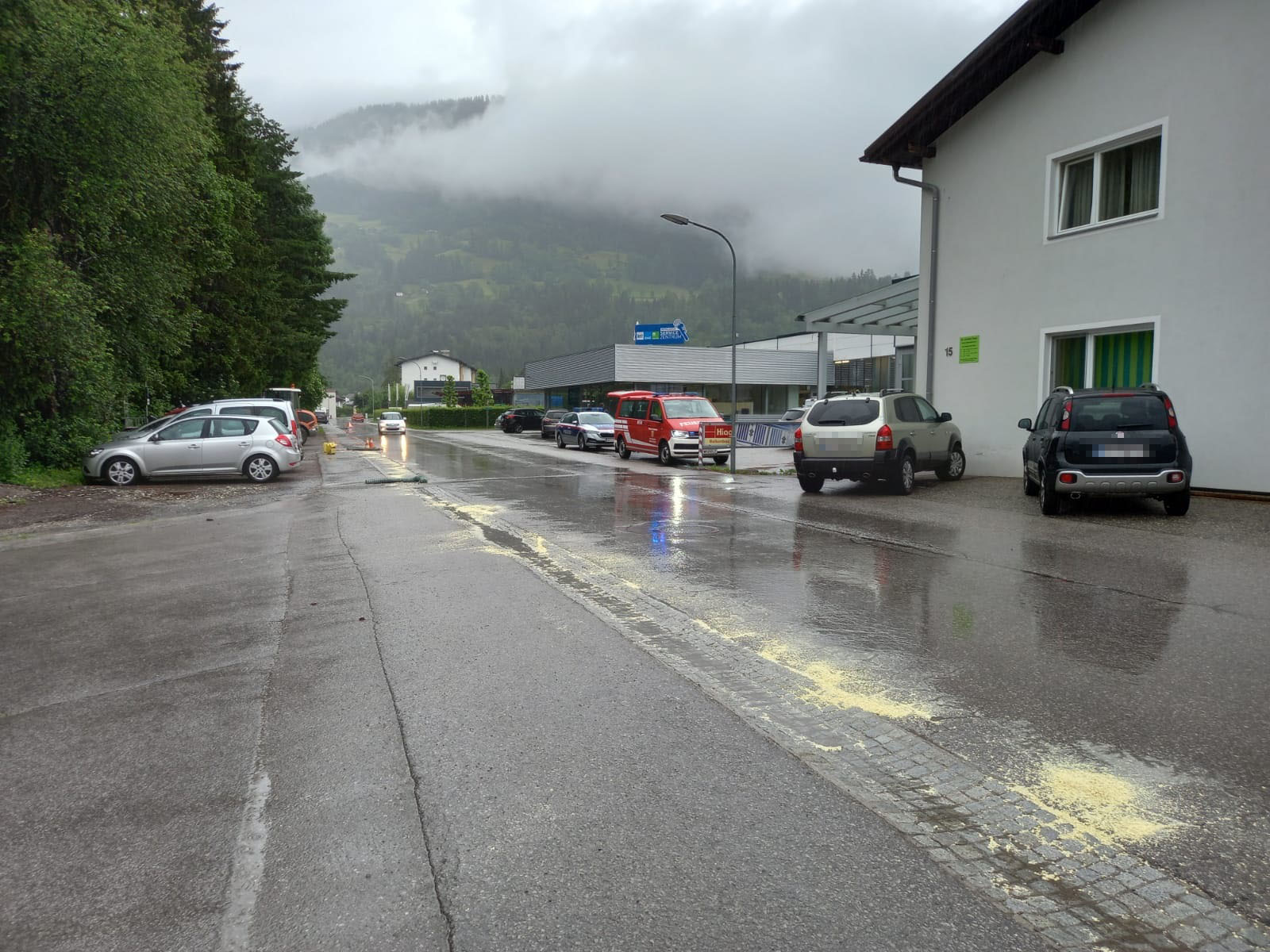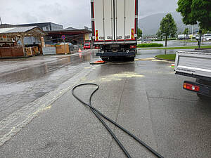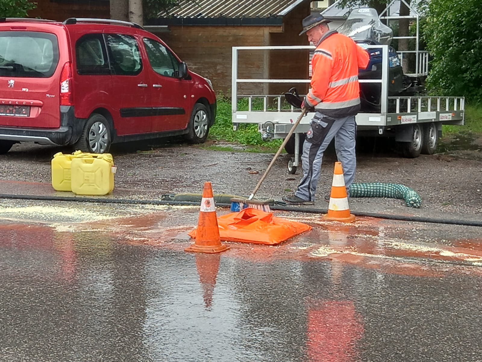 Am 07.06.2022 wurden wir am Morgen zu einer Ölspur alarmiert. Durch einen Schlauchplatzer bei einem LKW wurde das Öl freigesetzt und drohte nun, aufgrund des starken Niederschlages in den Kanal zu fließen.