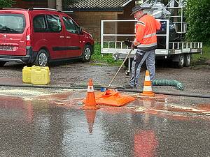 Wir haben umgehend mehrere Ölsperren errichtet sowie Kanaldichtkissen platziert. Das Öl-Wassergemisch wurde aufgesaugt und entsorgt.