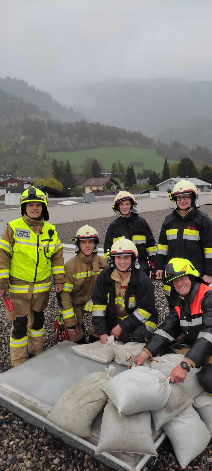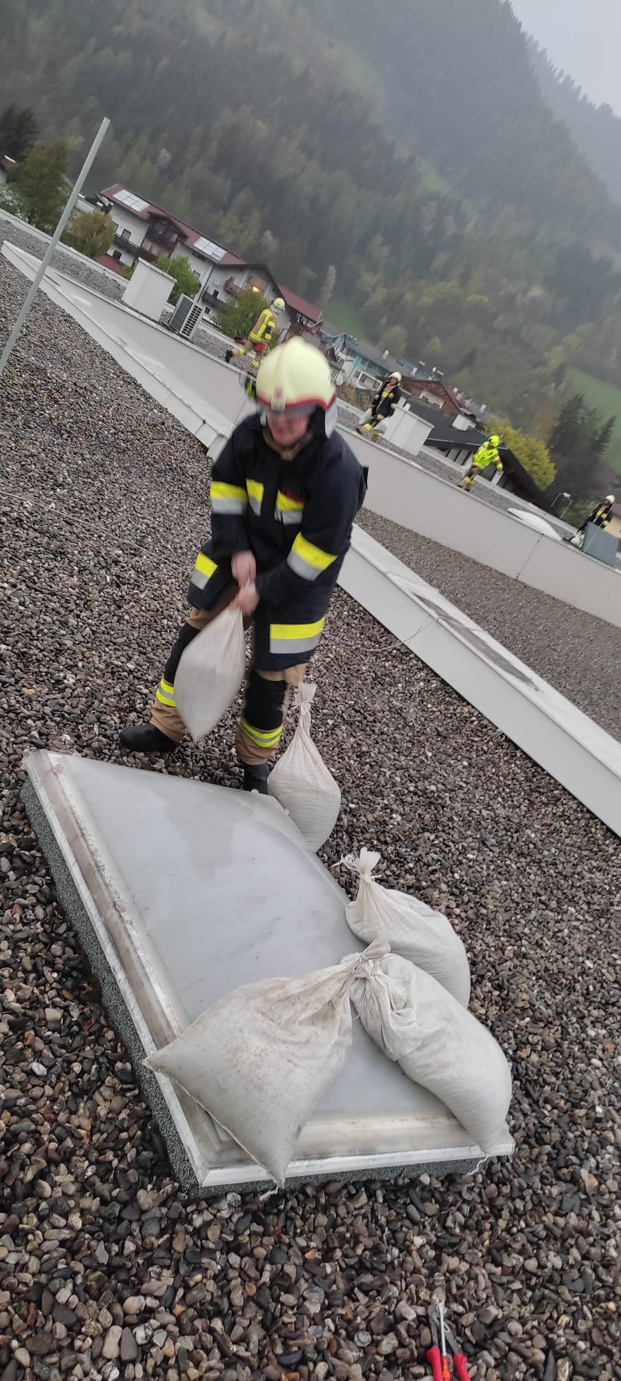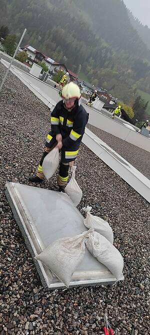 Wir konnten feststellen, dass durch ein defektes Dachfenster, welches vermutlich durch den starken Wind geöffnet und etwas beschädigt wurde, dieser Wassereintritt stattfindet. Wir alarmieren dementsprechend einen Kleineinsatz und fuhren mittels RLF und TLF, die mit Sandsäcken beladen wurden aus, um das Dachfenster provisorisch zu schließen und gleichzeitig zu beschweren.