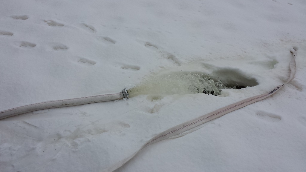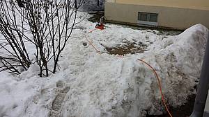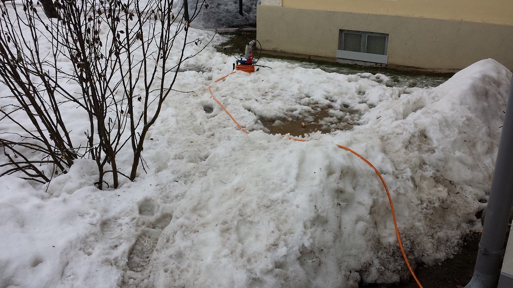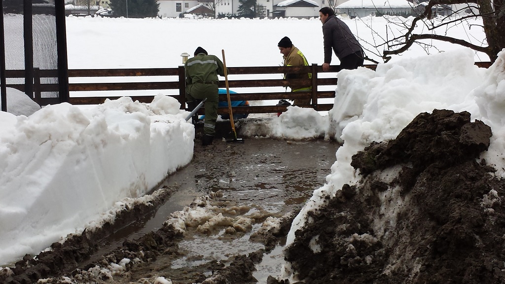 Am Donnerstag, den 20. Feber 2014 um 08.50 Uhr, wurde unsere Feuerwehr zu einem Arbeitseinsatz alarmiert. Beim Eintreffen stellte sich heraus, dass durch die enormen Schneemassen und dem Oberflächenwasser eines angrenzenden Berghanges Wasser in den Keller des nahegelegenen Wohnhauses geflossen ist. Aufgrund des hohen Wasserstandes im Keller benötigten wir spezielle Tauchpumpen. Zur Beseitigung der Schneemassen wurde ein Bagger eingesetzt, der den vollgesaugten Nassschnee rund um das Wohnhaus beseitigte und mit Sandsacken wurde ein Bachbett geformt. Nach stundenlangem Pumpen konnte das Wasser endlich aus dem Keller in das angrenzende Feld geleitet werden. Da es das Wasser aus zahlreichen Mauerritzen von draußen hereindrückte, war unsere Arbeit sehr schwer zu erledigen. Nach getaner Arbeit erhielten wir noch eine Stärkung und rückten anschließend wieder ins Gerätehaus ein.