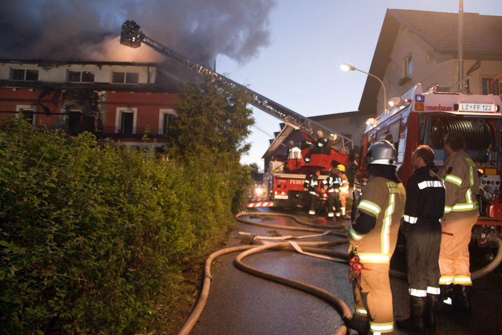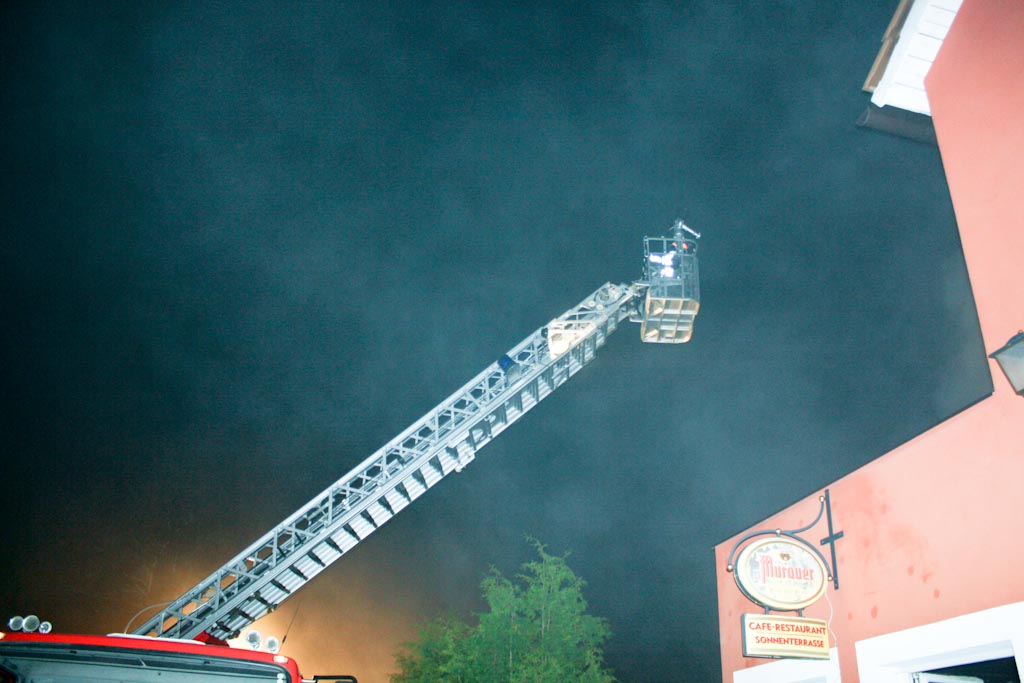 Um die Brandbekämpfung des inzwischen in Vollbrand stehenden Dachstuhles von zwei Seiten vorzunehmen wurde die Feuerwehr Flattach (Mölltal) mit der Teleskopmastbühne nachalarmiert.