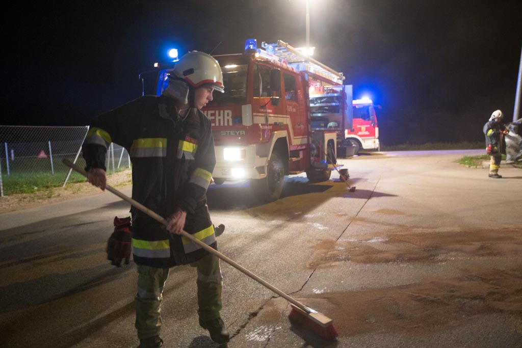 Am 10. Juni 2016 wurde unsere Feuerwehr um 00.30 Uhr mittels Pager zu Aufräumarbeiten nach einem Verkehrsunfall alarmiert. Bei der Ankunft am Einsatzort stellte sich heraus, dass ein PKW eine Straßenlaterne und anschließend eine Firmenmauer touchierte. Die verunfallten Personen wurden bereits von Erstrettern aus dem Fahrzeug befreit und anschließend der Rettung übergeben. Unsere Aufgabe bestand darin, die Unfallstelle zu beschädigten Fahrzeugteile aufzusammeln sowie die Unfallstelle auszuleuchten. Weiters wurde die Straße gesäubert und das ausgeflossene Öl gebunden. Danach konnten wir wieder ins Gerätehaus einrücken.