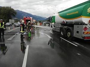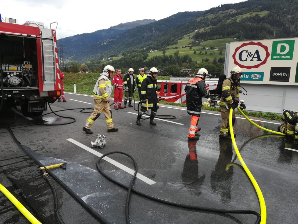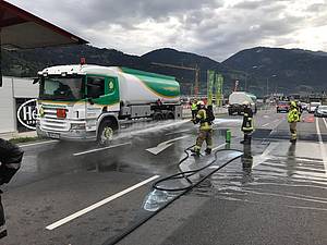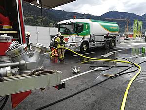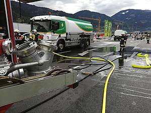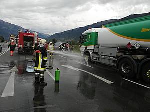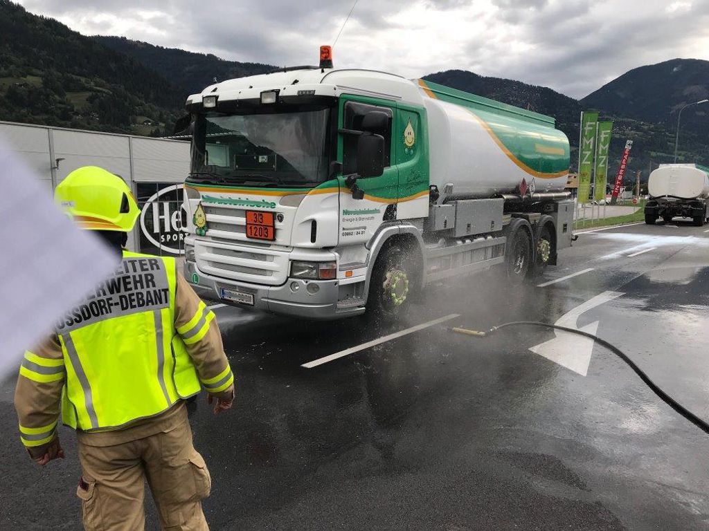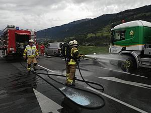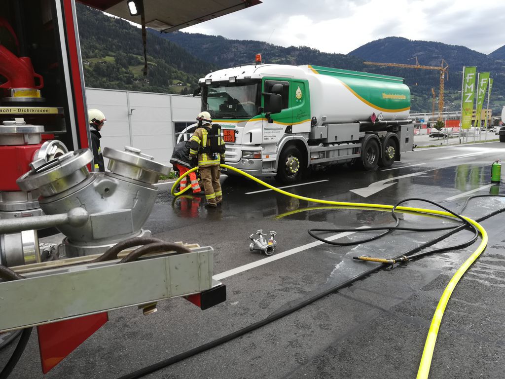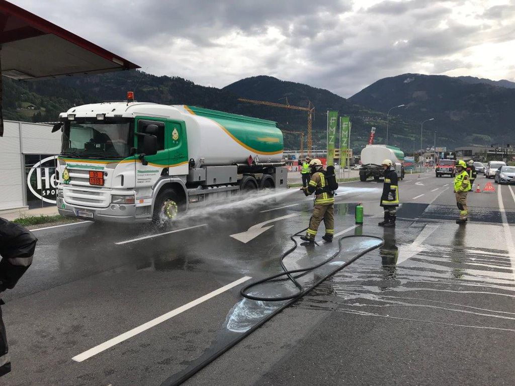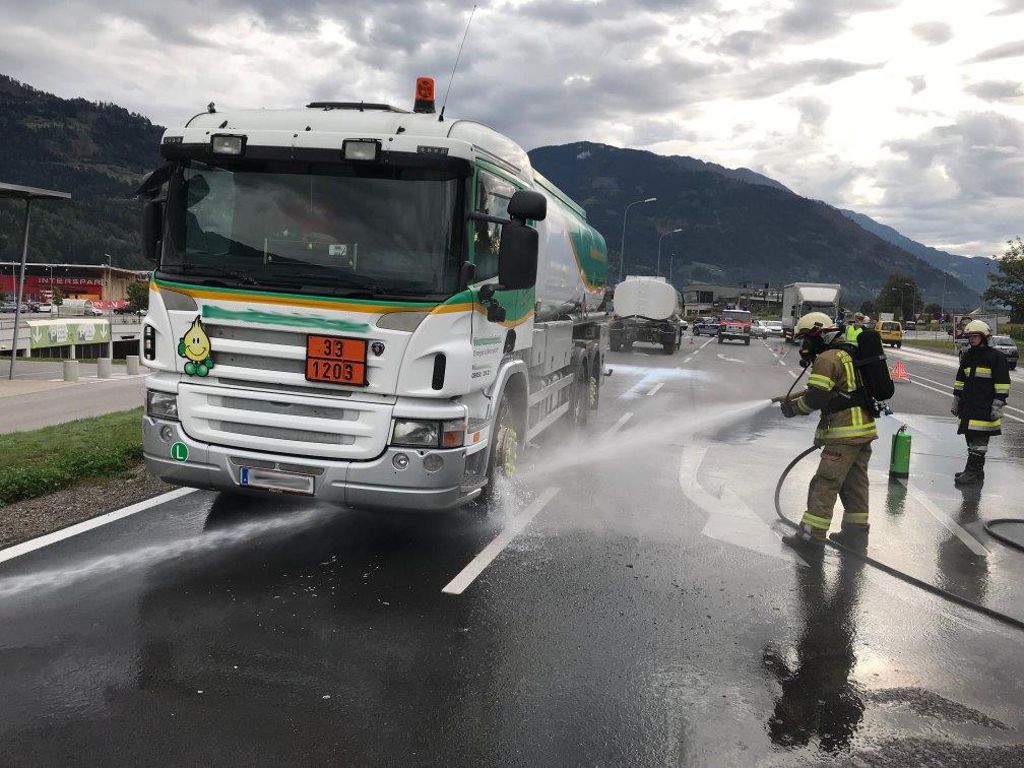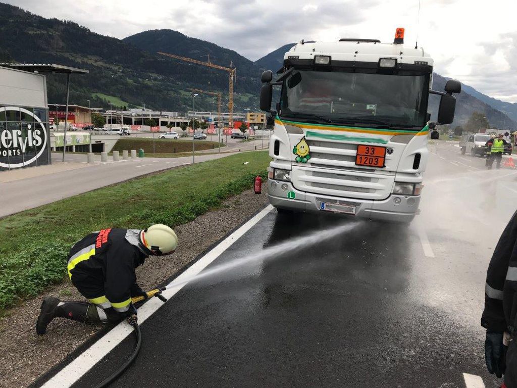 Am Mittwoch den 25.09.2019 wurden wir um 8:45 Uhr mittels Sirene zu einem LKW-Brand beim Glockner-Kreisverkehr gerufen. Hierbei handelte es sich um einen LKW-Hängerzug, welcher Diesel und Benzin geladen hatte. Zum Glück hatte der LKW-Fahrer den Anhänger nach bemerken der Rauchentwicklung vorsorglich auf der Bundesstraße abgehängt und den Motorwagen in ca. 50 m Entfernung abgestellt, um einen eventuellen größeren Schaden zu vermeiden, sollte das Fahrzeug in Vollbrand geraten. Beim Eintreffen am Einsatzort konnten wir eine starke Rauchentwicklung beim linken Vorderrad unter der Fahrerkabine feststellen. Sofort haben wir mittels Hochdruckschlauch mit schwerem Atemschutz die Löschung bzw. Kühlung durchgeführt. Auch das Sonderlöschmittel F500 konnten wir einsetzen. Weiters wurde ein 2-facher Brandschutz aufgebaut und die Straße abgesichert. Das nachkommende Rüstlöschfahrzeug hatte die Aufgabe, das Tanklöschfahrzeug mit Wasser zu versorgen und die ausgetretenen Flüssigkeiten zu binden. Durch das beherzte Eingreifen eines Passanten mittels Feuerlöscher und die schnelle Alarmierung der Feuerwehr konnte zum Glück ein größeres Unglück verhindert werden. Das Straßenbauamt hat noch die Straße mittels Verkehrszeichen „Öl-Unfall“ beschildert. Somit konnten wir nach ca. 1,5 Stunden wieder in das Gerätehaus einrücken.