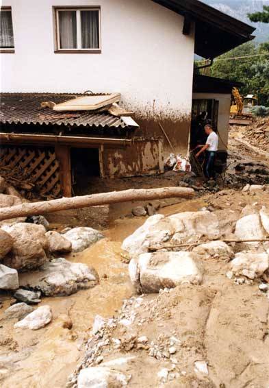 Unwetterkatastrophe mit Vermurung in der Wartschensiedlung in Nußdorf - Am 6. August um 20.15 Uhr ging über dem Nußdorfer Berg und Zettersfeld ein schweres Gewitter mit Hagelschlag nieder. Die ergiebigen Niederschläge lockerten den Boden auf. Im extrem steilen Mittellauf des Wartschenbaches zwischen 1.000 und 1.300 m Seehöhe wurden große Mengen an Geschiebe locker und mitgeschwemmt. Die Mure stürzte weitere Geröllmassen mitreißend durch das immer weiter und tiefer werdende Bachgerinne zu Tal. Die Geschiebesperre oberhalb der Siedlung fasste ca. 25.000 m³ dann schwappte die Mure über, trat in ganzer Breite über der Wartschensiedlung aus seinem Bachbett und ergoss sich urplötzlich über die ganze Siedlung. 22 Wohnobjekte(15 im Gemeindegebiet Nußdorf Debant, 5 in Gaimberg und 2 in Lienz) wurden hievon betroffen.
